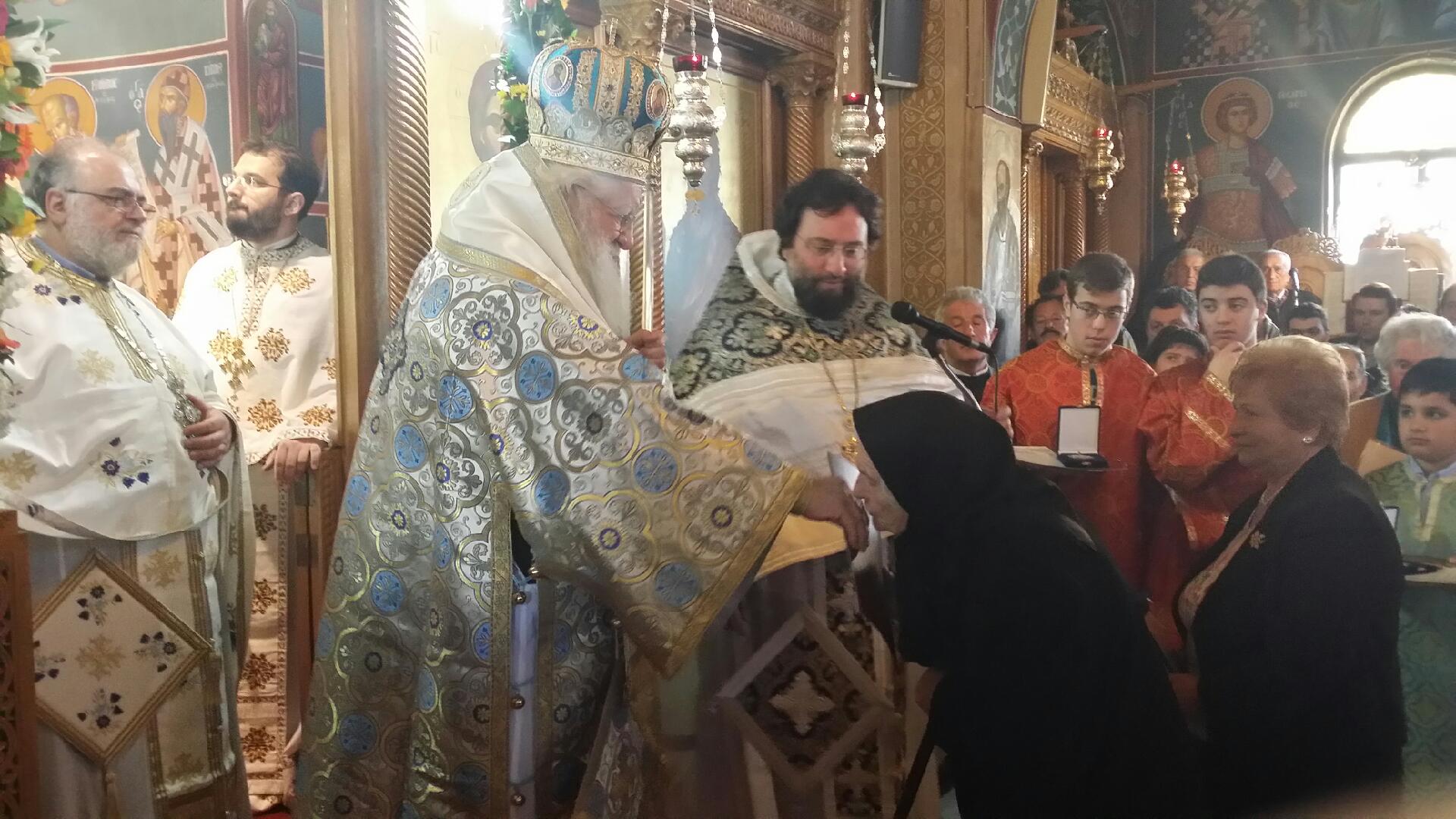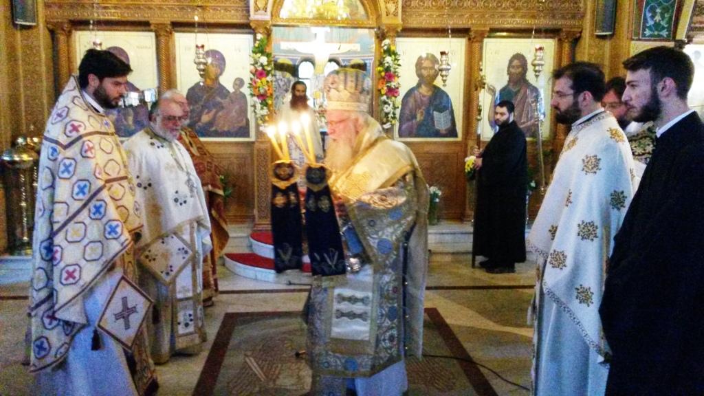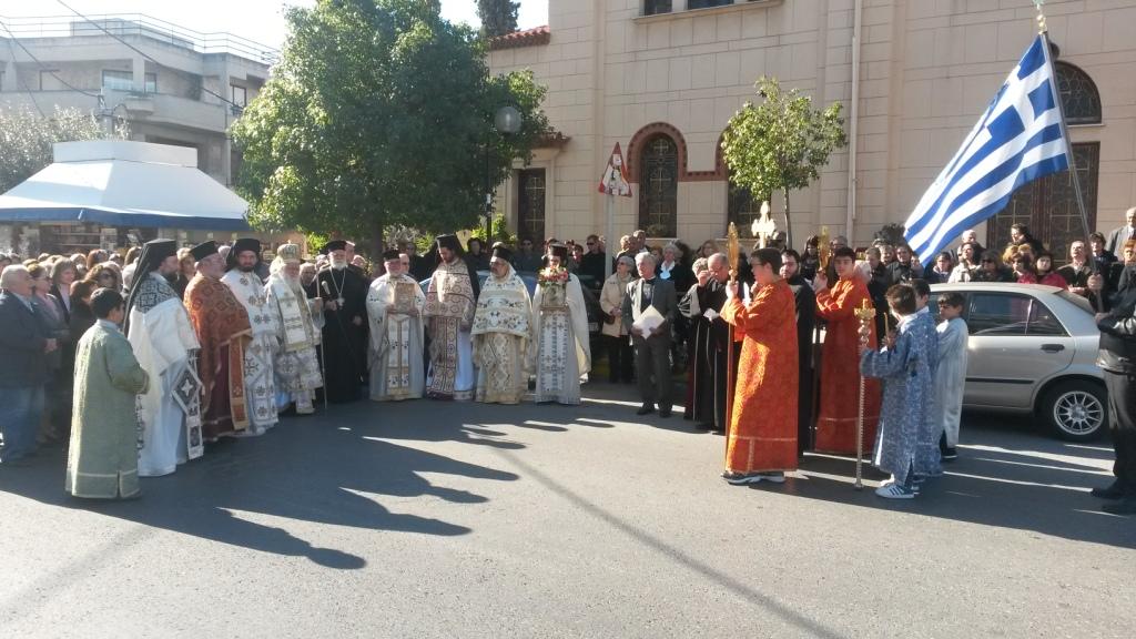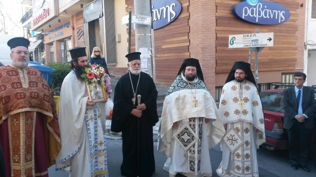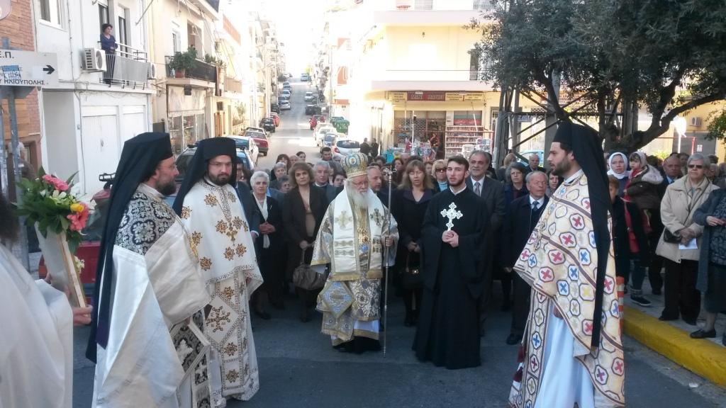 Την κυριώνυμο ημέρα, τελέσθηκε θεία Λειτουργία και λιτάνευση του εικονίσματος της Θεοτόκου, ιερουργούντος του Μητροπολίτου Βελεστίνου Δαμασκηνού. Προ της απολύσεως, ο Μητροπολίτης επέδωσε τους διορισμούς των νέων εκκλησιαστικών συμβούλων για την τριετία 2014-2016 και ενεχείρισε το μετάλλιο τιμής της ενορίας σε δύο παλαιούς εκκλησιαστικούς συμβούλους, τον Θεόδωρο Παπαδόπουλο που διετέλεσε αντιπρόεδρος του εκκλησιαστικού συμβουλίου και την Δήμητρα Σπανάκη που υπηρέτησε ως ταμίας αυτού, ενώ τους επαίνους επέδωσαν αντίστοιχα, ο Δήμαρχος Ηλιουπόλεως και ο Πρωτοπρεσβύτερος Σπυρίδων Μανταδάκης. Προηγουμένως απονεμήθηκε τιμητική πλακέτα εκ μέρους της ενορίας, στην πρεσβυτέρα Μαρία χήρα πρεσβυτέρου Δημητρίου Παλούκη, για την συμπλήρωση 100 ετών της ζωής της. Ο Μητροπολίτης Δαμασκηνός, συγχαίροντας την εκατοντάχρονη πρεσβυτέρα, είπε «πίσω από κάθε μεγάλο έργο κρύβεται μια γυναίκα. Στο έργο της σωτηρίας μας υπήρξε η Παναγία, την οποία και σήμερα τιμούμε στην ενορία σας, αλλά και πίσω από το έργο ενός ιερέως υπάρχει η θαυμαστή αρωγή μια πρεσβυτέρας που είναι ο Κυρηναίος, στο Γολγοθά της Ιερωσύνης». Ο πρόεδρος του εκκλησιαστικού συμβουλίου Αρχιμανδρίτης Σεραφείμ Δημητρίου, κατά την ανακοίνωση των αποφάσεων για την απόδοση τιμής στα ανωτέρω πρόσωπα, ανέγνωσε και επιστολή του Μητροπολίτου Φωκίδος Αθηναγόρα, με την οποία συγχαίρει για την τιμή της εκ Δωρικού Φωκίδος πρεσβυτέρας, και εύχεται εις αυτήν αναφερόμενος στην διακονία του μακαριστού πρεσβυτέρου Δημητρίου, στην ορεινή Δωρίδα.